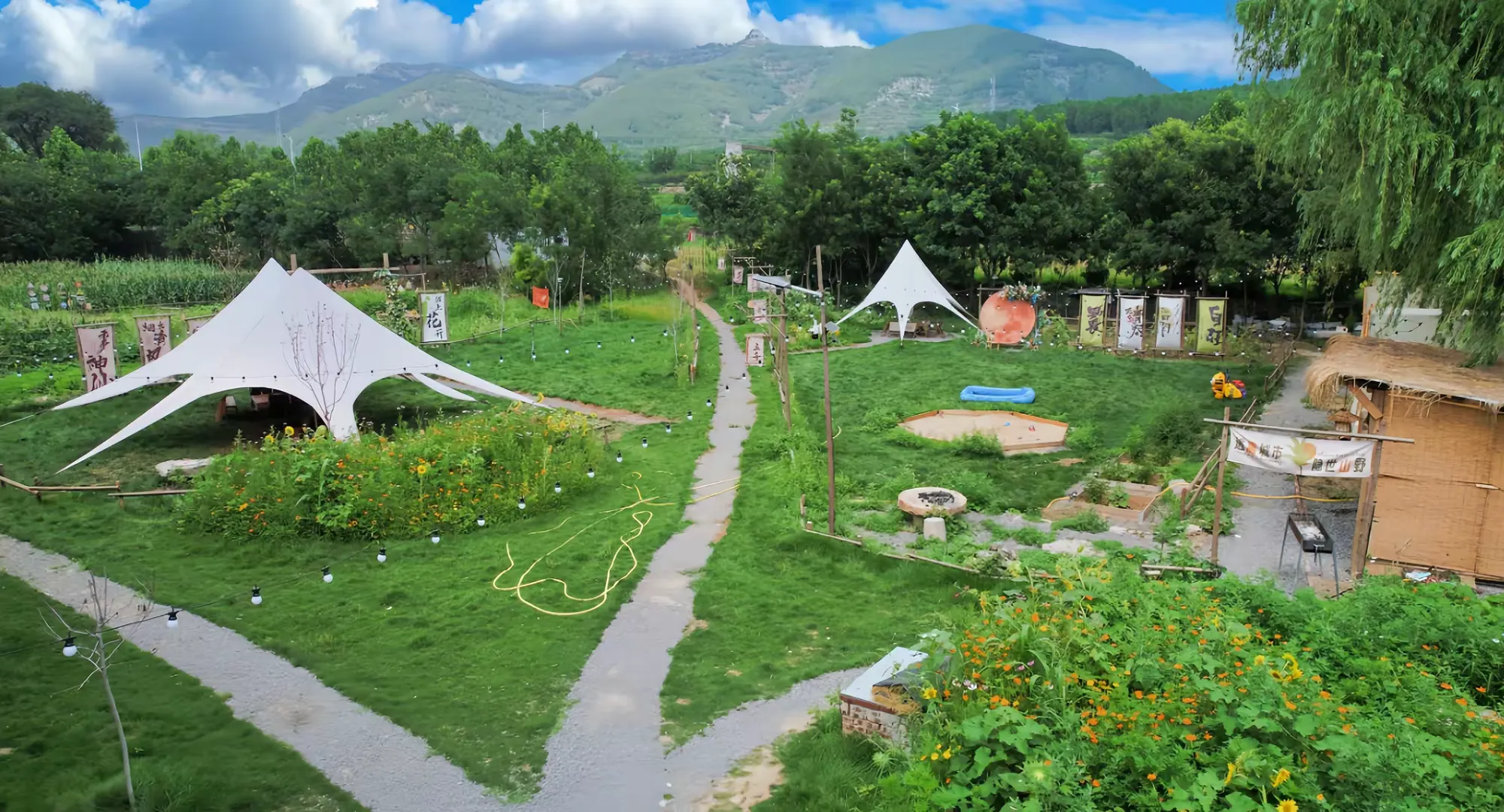 舜耕九州花筑·田园雅居: 园区目前已建成7个院落,更有特色木屋房给儿童带来别样的体验。住在这里,晚上可以躺看银河璀璨,清晨可以被鸟鸣唤醒,同时营地提供户外烧烤、亲子农耕体验,让城市家庭回归自然本真。